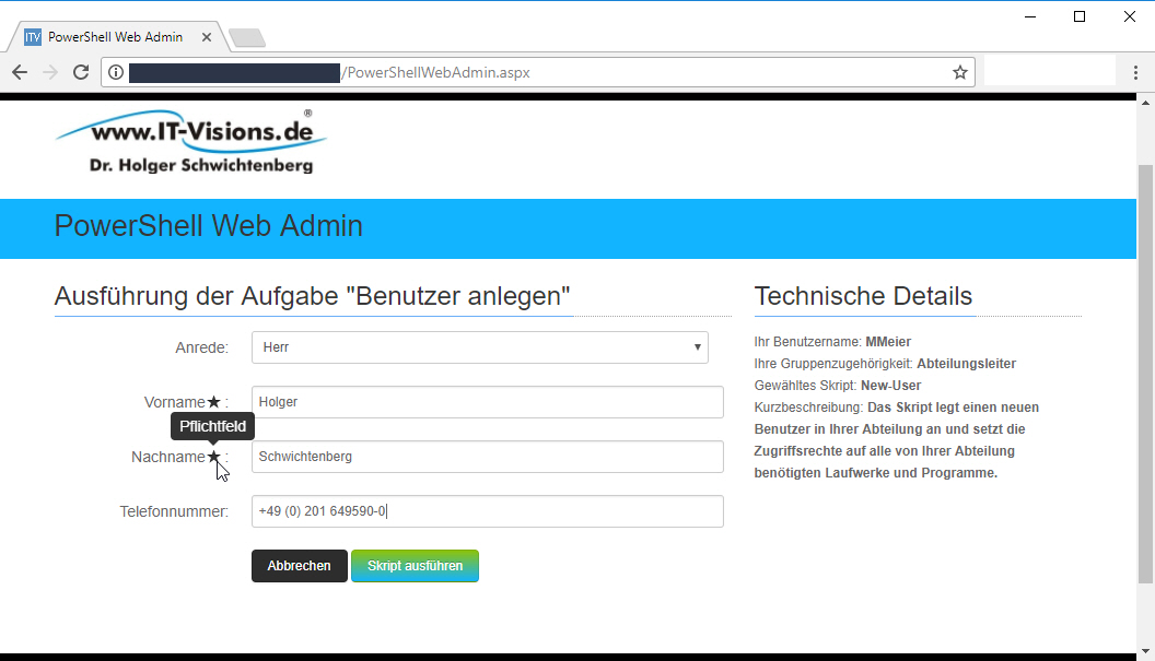 Wir besitzen eine webbasierte Lösung mit Namen "PowerShell Web Admin" für delegierte Administration. Die berechtigten Benutzer können im Browser aus einer Liste von Ihnen zugewiesenen Skripten auswählen und in einer Eingabemaske die Parameter für das gewählte Skript erfassen. Die Benutzer erhalten das Ergebnis wahlweise als Webseite oder per E-Mail.